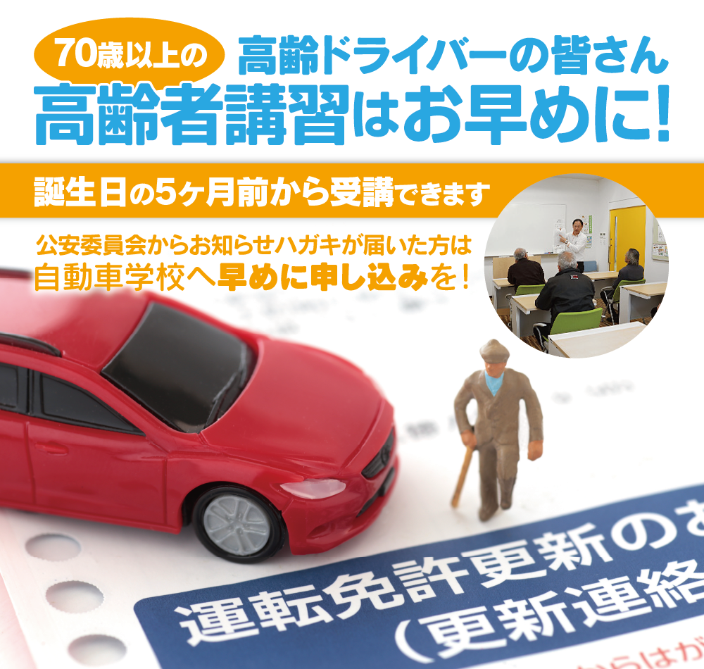 高齢者のみなさん、 「今年から、始めて高齢者講習対象になり、不安。」 「高齢者講習を受けたいけど、どうすればいいのかわからない。 」 「普段、軽四を運転しているため、大きい普通車での実技講習がうまく運転できるか不安。」 高新自動車学校は、安心・丁寧・わかりやすい 高齢者講習専任スタッフが分かりやすく、丁寧に講習致します。 高新自動車学校では、高齢者講習専用の軽自動車で 実技講習ができます。 普段、軽自動車を運転されている方に安心! 誕生日の5ヶ月前から受講できます。お気軽にご連絡ください。 尚、高齢者講習及び認知機能検査を受けるためには、事前の予約が必要です。